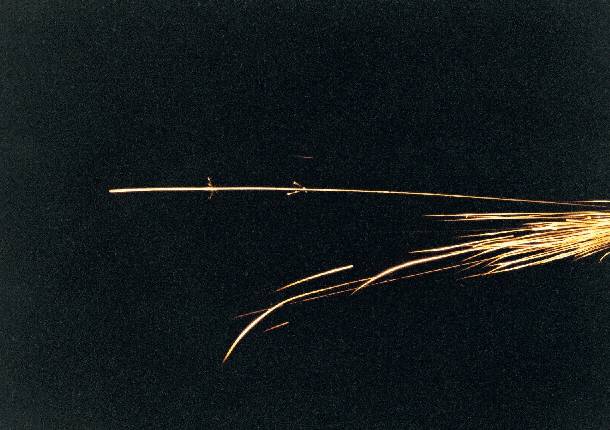 1.火花全体像 ・炭素破裂はなく、中央部および先端部に白いふくれが認められる。 2.中央から先端像(拡大) ・炭素破裂はなく、中央部および先端部に白いふくれが認められる。 3.中央から先端像(拡大) ・炭素破裂はなく、中央部および先端部に白いふくれが認められる。 4.中央から先端像(拡大) ・炭素破裂はなく、中央部および先端部に白いふくれが認められる。 5.中央から先端像(拡大) ・炭素破裂はなく、中央部および先端部に白いふくれが認められる。 |