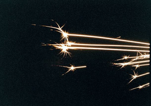 1.火花全体像 ・火花は短く、白っぽい。先端で数本破裂が見られ、その先の流線はない。 2.中央から先端像(拡大) ・火花は短く、白っぽい。先端で数本破裂が見られ、その先の流線はない。 3.中央から先端像(拡大) ・火花は短く、白っぽい。先端で数本破裂が見られ、その先の流線はない。 4.中央から先端像(拡大) ・火花は短く、白っぽい。先端で数本破裂が見られ、その先の流線はない。 5.先端像(拡大) ・火花は短く、白っぽい。先端で数本破裂が見られ、その先の流線はない。 |