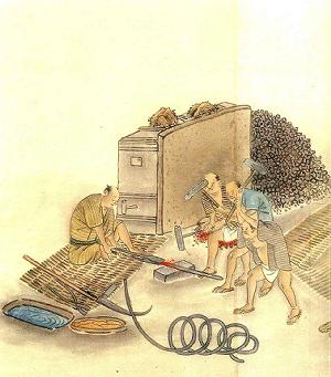 割鉄(軟鉄)の一部を加熱した鉄材を3人の手子が鎚で打ち延ばして棒材から線材にしているようすが描かれています。 らせん状に束ねてもう一度350℃程度に加熱した後ゆっくり冷却します。 これは加工工程で少し硬くなった鉄材を軟ら赤くするためです。 針金製造 さらに細くするために、いろいろな径の孔が開いている鉄板に線材を差し込み、 巻き取りロールで線材を伸ばして細くし巻き取るようすが描かれています。 テコの応用で木製のロールを90度ずつ回転しながら巻き取っています。 次にもう一段細い孔を通して線材を製造していきます。江戸時代の技術を画いた貴重な絵図です。 |