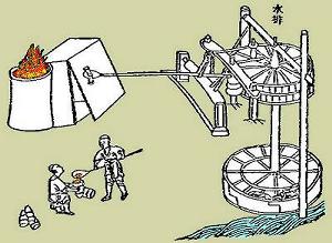 従来の皮嚢式のふいごに比較して風量・風圧ともに増大しました。河南省安陽県で 発掘された製鉄用高炉は高さ4m、直径2.6mで断崖地形を利用して構築してあり、断崖上面に鉄鉱石と 木炭が残されていました。又、同様の高炉が河南省林県鉄生溝でも11基発見されました。