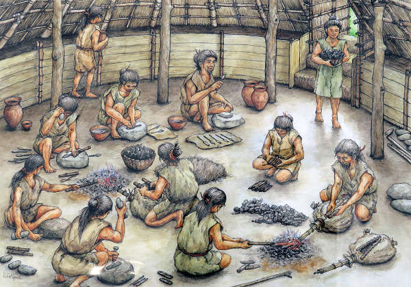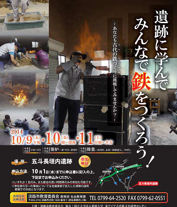 淡路市にある五斗長垣内遺跡で『遺跡に学んで みんなで鉄を作ろう』こんなタイトルのイベトが開催されますが、ご存じですか? 期間は10月 9日〜10月11日で主催者は淡路市教育委員会です。パンフレットも添付されていました。 この遺跡は2001年(平成13年)に発見され、2007年(平成19年)から発掘調査が実施されました。 『弥生時代の鍛冶屋むら発見』などと新聞等で大々的に発表された紀元1世紀から2世紀にかけて矢じりなどを百数十年間作っていた遺跡で話題を呼びました。 砂鉄を使ってミニたたらで製鉄をするイベントに参加し、展示されている鍛冶作業の復元イラストについて教育委員会の発掘担当者に質問しました。 『ふいごの羽口は出土したのですか?』担当者『いいえ』 私『どうしてふいごの使用を推定したのですか?』担当者『ふいごの羽口は有機物で作られ残ってはいませんが、 それを包んだと考えられる円形のくぼみを持つ粘土塊が発掘されています。それで使用を推定しました。』 そう説明を受け納得しました。動物の皮を丸はぎにして羽口を付け、手で押しやすいように棒で工夫されています。 |