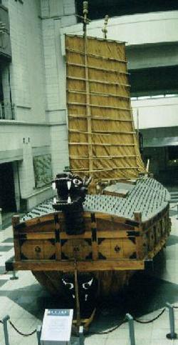 韓国の英雄の第一に挙げられる、李 舜臣(りしゅんしん)は朝鮮水軍の名将で、豊臣秀吉が朝鮮侵略した時、 亀甲船(きっこうせん)を建造し日本軍を撃退しました。戦争記念館には1/4の模型が展示されていました。 この船のいかりは木製のものが装着されていていましたが、隣にあった模型には石を抱かせた、 木製の碇があったので写真を撮りました。