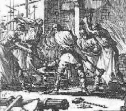 中の絵はヨーロッパの港町の鍛冶屋さんが2本爪の錨を鍛造している様子です。 窓の外に帆船のマストが見えます。(1600年代のドイツ)