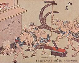 而して其錨縄は苧麻、檜、蕨、藁等三糾(さんきゅう」の大索を用う、苧麻縄を以て最とも堅靭なりとす。 船用の語に之を加賀苧綱と云ふ) 絵は、鉄鎚を振り上げる三人が、錨の爪のところを叩いて作っているところです。