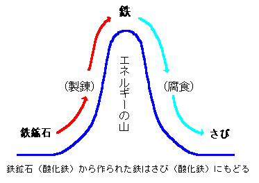 しかし、自然は人間が加えたエネルギーを無にするのです。エネルギーはまるで 谷底へころがり落ちるように低下してゆきます。鉄は水を媒体として酸化し安定な形に もどってゆきます。それがさびるという事です。自然の営みによって人間は膨大な損失をこうむります。