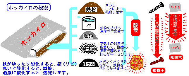 発熱の原理は ゆっくりと起こる燃焼(酸化)なのです。温度と時間を調整する工夫がされています。