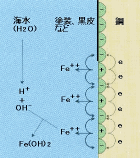 海洋環境にさらされる鋼の腐食は電気化学反応で起こります。つまり鋼の表面に