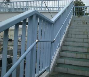 この写真は名古屋市港区にある歩道橋の手すりです。(2002年9月撮影)鉄に塗装を施したパイプをステンレスの固定金具で留めています。