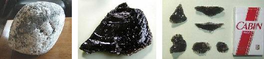 写真は左から 原石 破面(気泡が見える) 小片(ナイフとして使える)