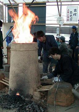 新見市の古代製鉄再現は4年目で、紺色の作務衣に真っ赤の『炎』刺繍のついた、たたら保存会の人々や