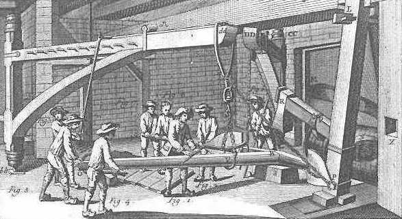 2トンほどもある錨のようです。(現在の錨では2トンのものは 長さ 3,470 mm 幅 2,340 mm あります。) くさりでぶら下げ、炉から取り出し、木製のクレーンを使った作業は大変な重労働だったにちがいありません。 ハンマーは水車利用と思われます。中央の帽子を被った人が責任者です。 鍛造の錨を作るのは、今 も大差無いのでしょう。(ハンマーが水車から空気圧に変わったくらいかな?)