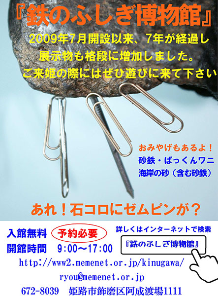 砂鉄や鉄鉱石をたくさん展示していますので、ぜひ遊びにきてください。