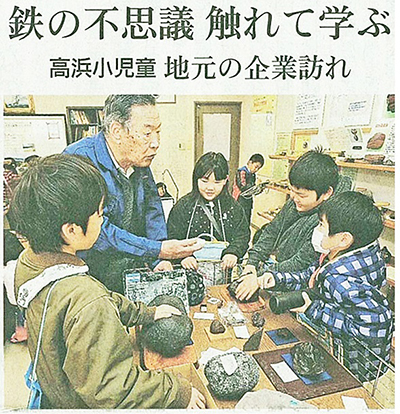 『 小学生が大勢見学! 』 母校の小学生が大勢見学に来ました。 『鉄のふしぎ博物館』は広くありません。 そこに3年生の児童30人と先生方が4名、 新聞記者と私の合計36名。 すし詰め状態で走り出す子どもも てんやわんやの状態でしたが、 A・Bの2チームに別れ、 工作チームは『ぱっくんワニ』を作ります。 整然と見学が始まりました。『石ころは磁石につきますか?』 私の説明に小首をかしげたり、大きく頷いたり。 ドンドン質問が出て、あっという間に予定の時間。 活発な子ども達に元気をもらいました。 後に、礼状が届きました。 当日の様子を掲載した、神戸新聞の記事です 画像をクリックすると記事の全文が読めます。