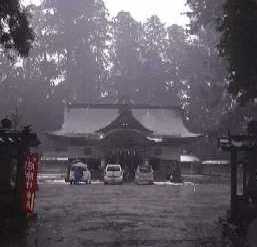 国道に隣接した境内は1万6千坪、杉の大木で覆われ昼なお暗く、参道の燈籠は点灯されていました。