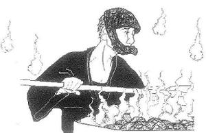 昭和52年の『たたら製鉄』の復元に従事されました、故 阿部由蔵村下をイメージした操業風景の