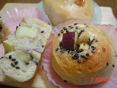 成形発酵:2分割してベンチタイム30分。四角く伸ばしてサツマイモ(角切りして砂糖まぶして電子レンジ4分)&黒ゴマ、キャラメルチョコチップを巻き込み、それぞれ8つにカット。室温で90分。