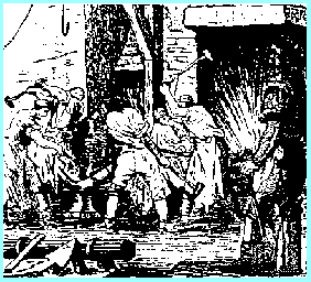 A left picture shows the state that a blacksmith of the European port town is making two anchors of the nail with forging process.