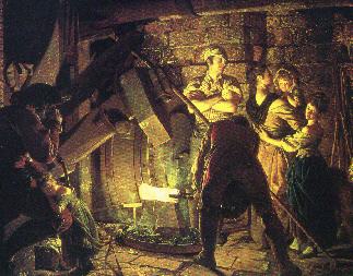 A right picture shows the picture of a forging shop which the painter of Joseph Right who lived in the Dabee district of England drew in 1772. A hammer that the water mill to make wrought iron in those days was used there is being drawn.