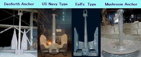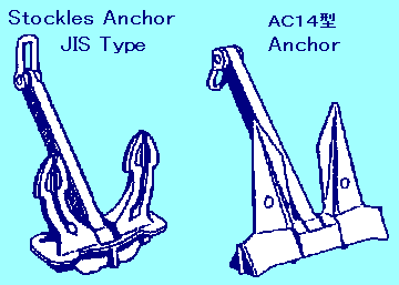 The anchors generally being used in the anchor made of the cast steel are stockless anchors and common anchors. But, the anchor that various ideas are made is studied and developed because the power which scratches the bottom of the sea of stockless anchors is weak. One of them is the AC14 type anchor that was developed in Japan. JR was using the anchor of the type JNR which was an archetype for the type AC14, from former times after the accident of the Toyamaru. There are anchors of the kind shown in the following in addition to these. Some are introduced here.