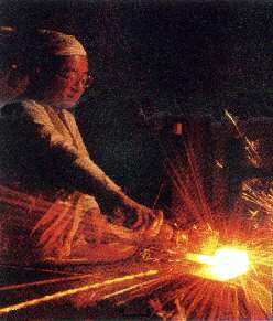 The lump of Ta-ma-Ha-ga-ne is heated, and hammered into flat sheets. This is the starting point of forging.