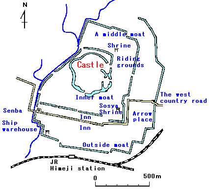 Nakabori or Middle Moat touched the present National Route 2 and Sotobori or Outer Moat touched JR Station.