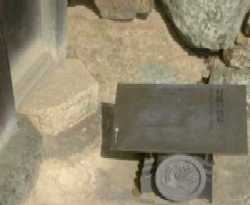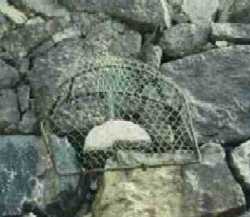In the middle of the stone wall you can see a fragment of a hand millstone covered with a wire net.